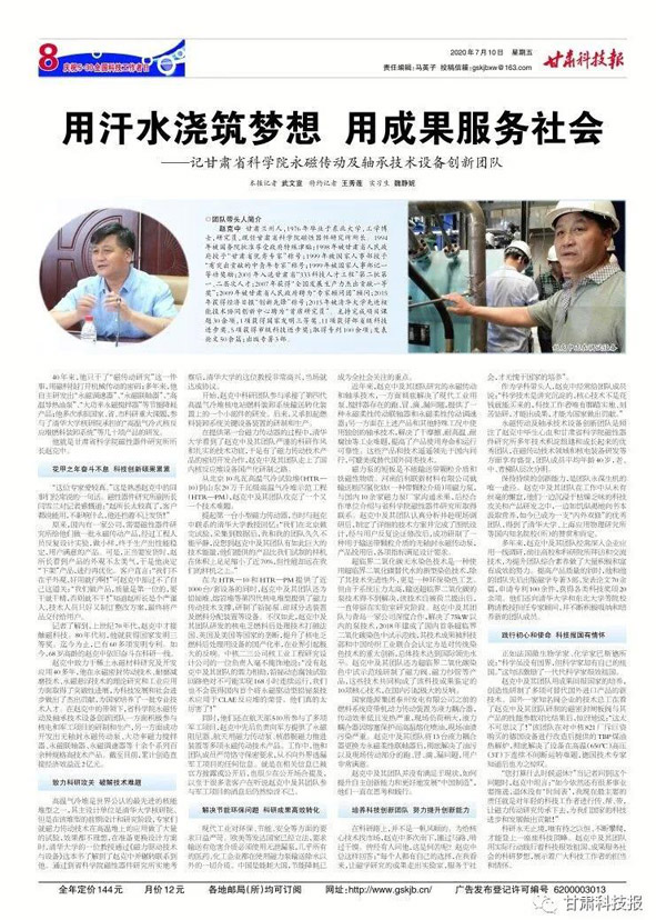 用汗水澆筑夢想 用成果服務社會——記甘肅省科學院永磁傳動及軸承技術設備創新團隊