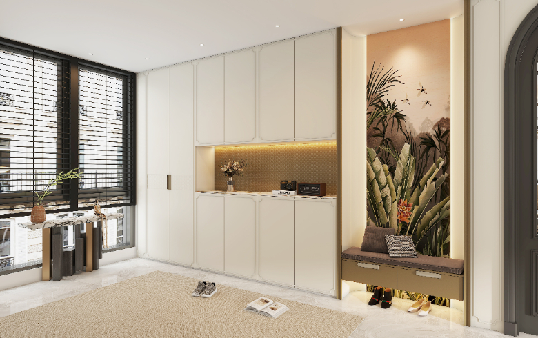 古典的優(yōu)雅氣場(chǎng),融入自然的生機(jī),靜待時(shí)光歲月靜好。入戶柜由高柜和懸浮柜組成,足夠放下一家人的鞋子,還可以收納家政雜物。