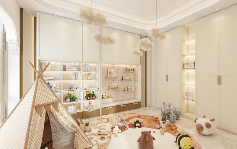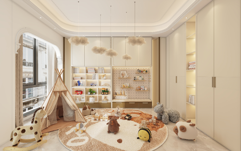 玩樂區(qū)放滿各種洋娃娃,守護(hù)天真爛漫的童年。暖色調(diào)現(xiàn)代感的兒童房,大面積的落地窗,明快的配色,既能培養(yǎng)孩子開闊的胸襟,也有利于增加他的擴(kuò)散性思維和創(chuàng)新意識(shí)。