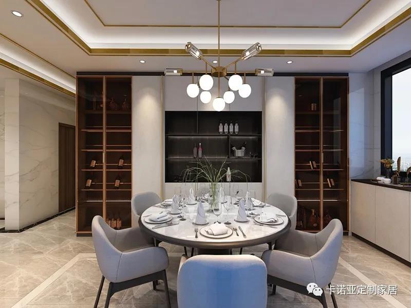 首先,將廚房擴(kuò)大改成玻璃推門增加自然光,其次利用窄墻做對(duì)稱式入墻多功能餐邊柜,