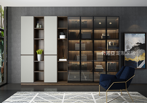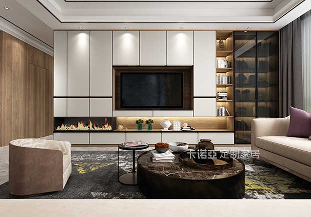電視柜半開(kāi)放設(shè)計(jì),黑框金屬玻璃門(mén)的搭配使得整個(gè)空間更富有立體感。