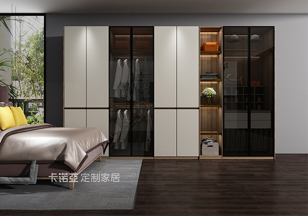 衣帽間襯衫、外套、衣服、鞋子,分類(lèi)擺放,精致大氣。四季衣物擺放分明,玻璃櫥窗設(shè)計(jì)讓衣服簡(jiǎn)潔明了,拿取方便。