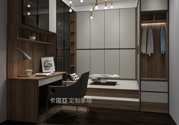 客臥榻榻米設(shè)計(jì)感獨(dú)特,大面積運(yùn)用白色,會(huì)讓整個(gè)空間看上去明亮很多,地板是木色的瓷磚鋪貼,梯柜設(shè)計(jì)增加儲(chǔ)物空間,書(shū)房+衣柜+臥房+待客室,一室多用,功能滿(mǎn)分。