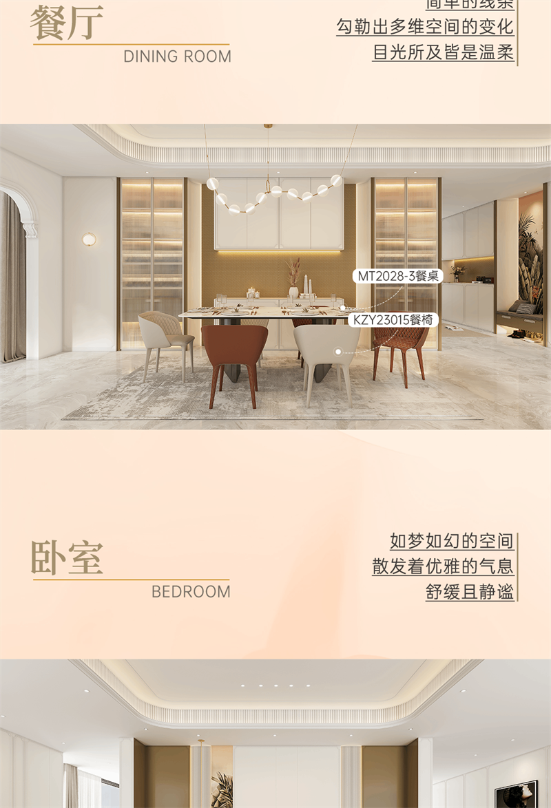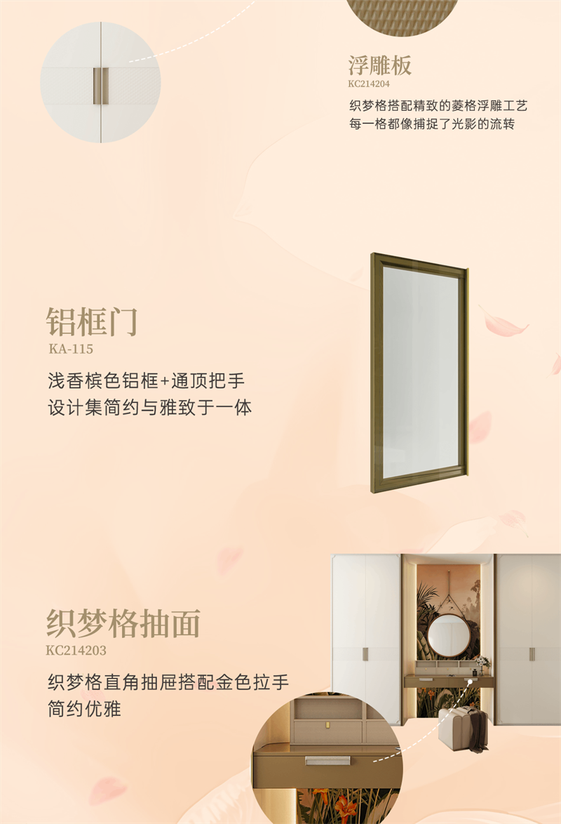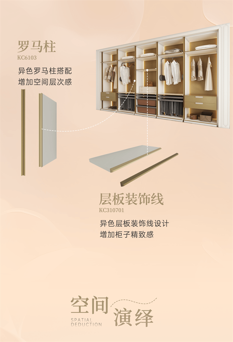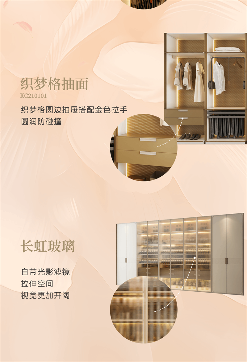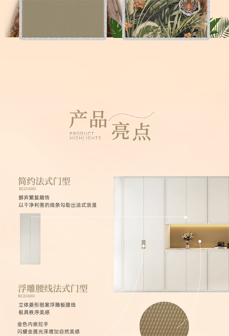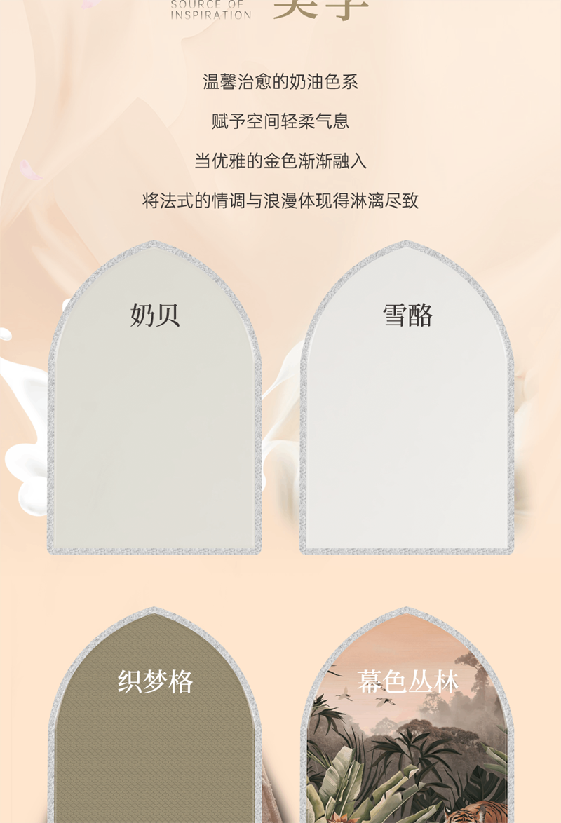 系列產(chǎn)品整體以奶油白和金色元素為空間基調(diào),將法式的氣質(zhì)融入現(xiàn)代空間,以精致細(xì)節(jié)的融入,讓家成為容納更多想象的美好生活殿堂,讓“美”成為一種生活態(tài)度。