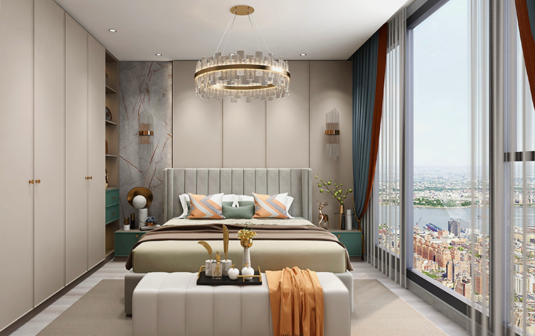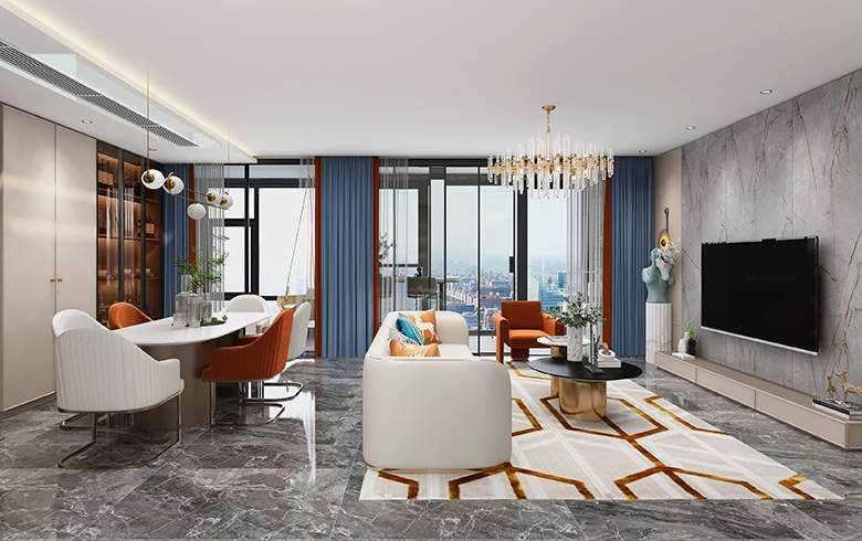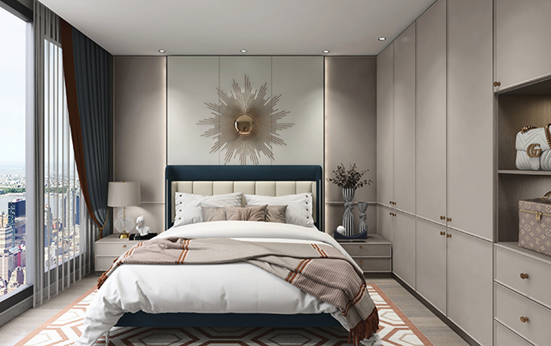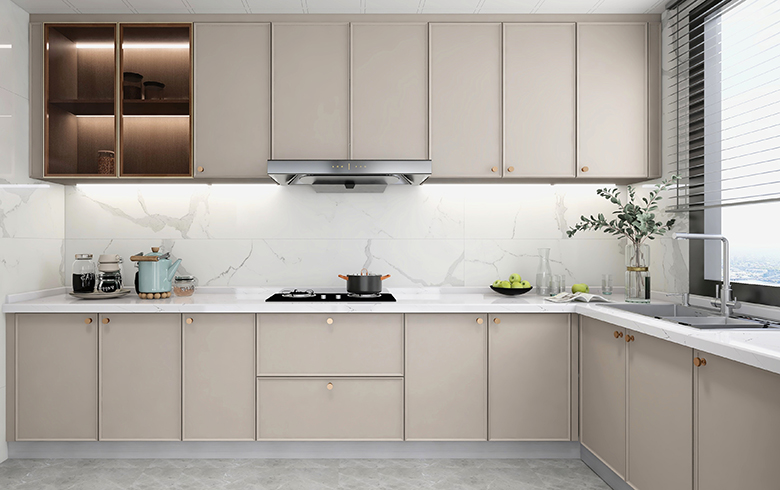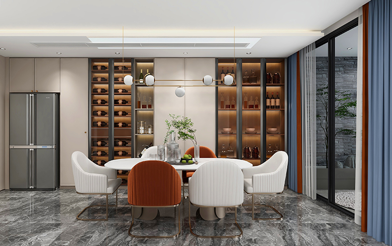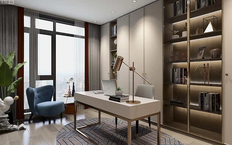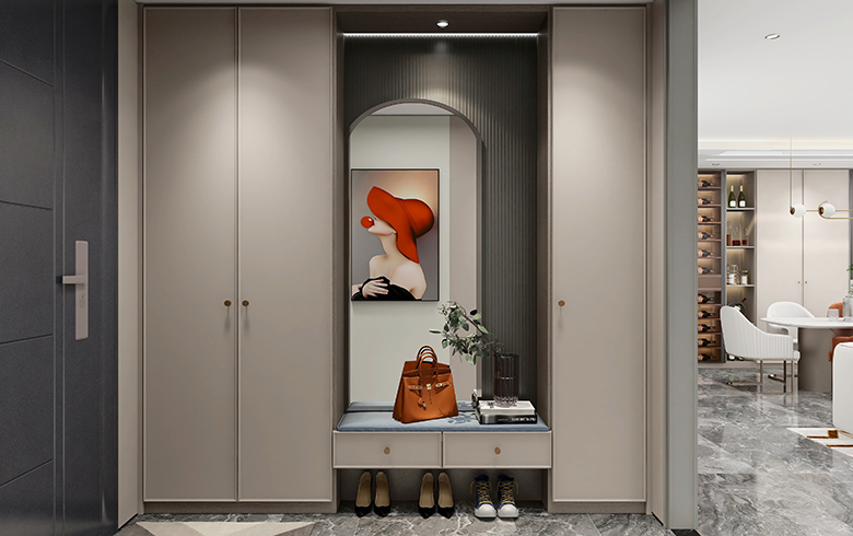 過道盡頭設(shè)計(jì)一排吊柜,“優(yōu)雅暖灰”柜門混搭“流光漫步”柜體, “黑金剛”地臺(tái)搭配“慕尼黑”格柵板,酷尚而精致。