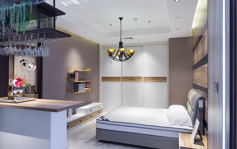 大面積運(yùn)用橄欖木+高原雪橡/印象白的撞色搭配,給人明朗、活潑、自然之感。150°弧形板展示架,帶給空間更多美妙的曲線。