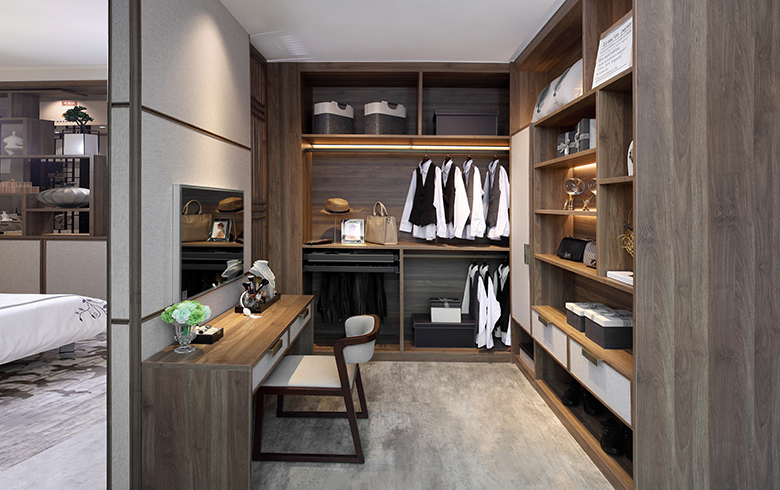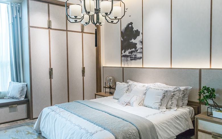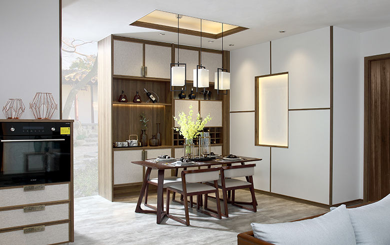空間強(qiáng)調(diào)“只可意會(huì)、不可言傳”的空靈之美。木色、白色、淺灰色的組合,如同淺淡的水墨畫,極具煙雨江南的朦朧美感。客廳運(yùn)用正方吊頂、水墨護(hù)墻、仿古宮燈等中式元素飾品進(jìn)行點(diǎn)綴,體現(xiàn)了中國傳統(tǒng)美學(xué)的精神,散發(fā)出亦古亦今的層次之美,輕松讓人沉醉在這意境美之中。