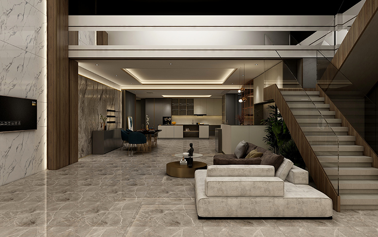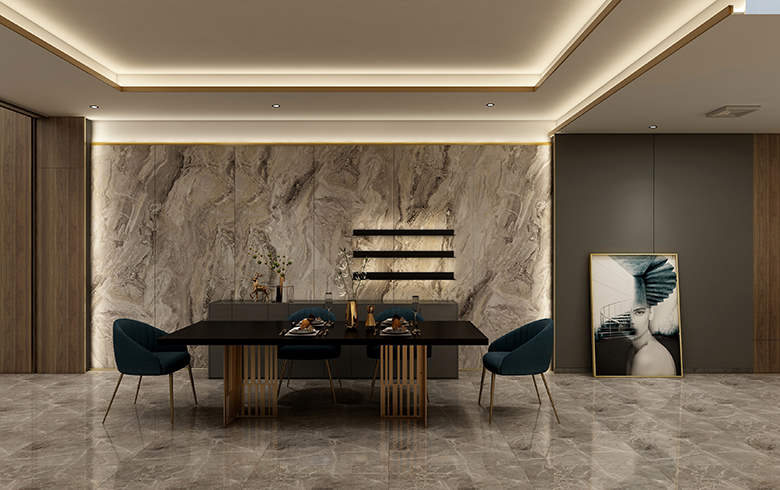 “御品木”溫柔的木紋,碰撞3D大理石硬朗的石紋,極簡(jiǎn)“銀河黑”過(guò)渡,一起裝飾餐廳背景墻,打造尊榮的就餐儀式感。