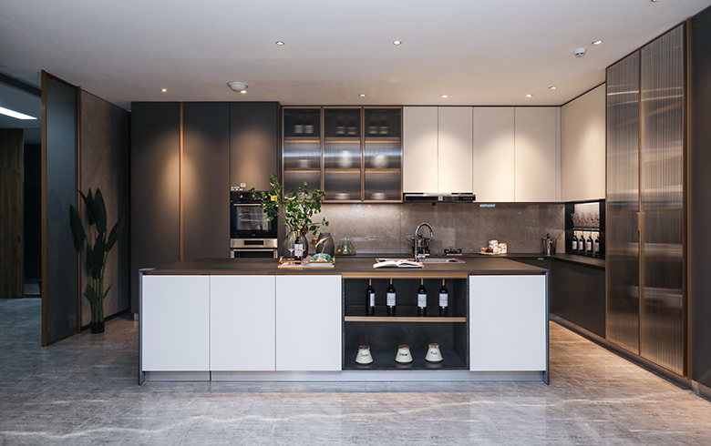 一柜到頂收納超強(qiáng),中島臺(tái)加入,時(shí)刻保持臺(tái)面整潔,長(zhǎng)虹玻璃與無(wú)拉手門(mén)板加持,讓廚房簡(jiǎn)雅而敞亮。