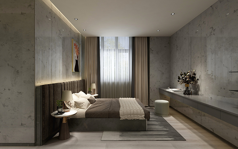 “霧光灰”護(hù)墻板百變紋理,點(diǎn)綴亮色掛畫(huà),為灰色臥房注入活力。長(zhǎng)條形懸空柜可化妝可學(xué)習(xí)可收納,將空間裝飾的修長(zhǎng)而雋永。