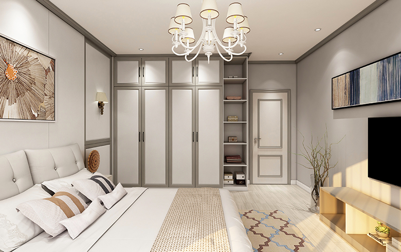 簡(jiǎn)歐風(fēng)格特有的方正造型灰色邊框的木門(mén),一改木門(mén)平面單一的視覺(jué)印象,同時(shí)與到頂衣柜、護(hù)墻板在紋理及材質(zhì)上相呼應(yīng),整體空間寧?kù)o素雅,溫暖直抵人心。