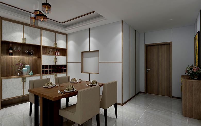 餐廳護(hù)墻系統(tǒng)巧妙運用專利扣線,將墻面護(hù)墻板無縫銜接,構(gòu)筑中式特有的回字形造型,整體簡潔美觀、雍容大方。