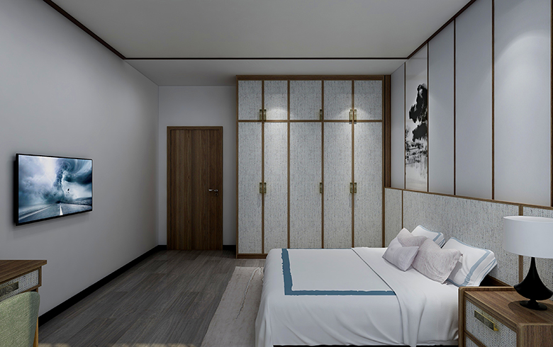 護(hù)墻系統(tǒng)由簡潔大方的印象白與御品木拼接而成,加上山歌墨舞等中式元素的運用,將整個新中式臥房空間點綴的莊重而優(yōu)雅。