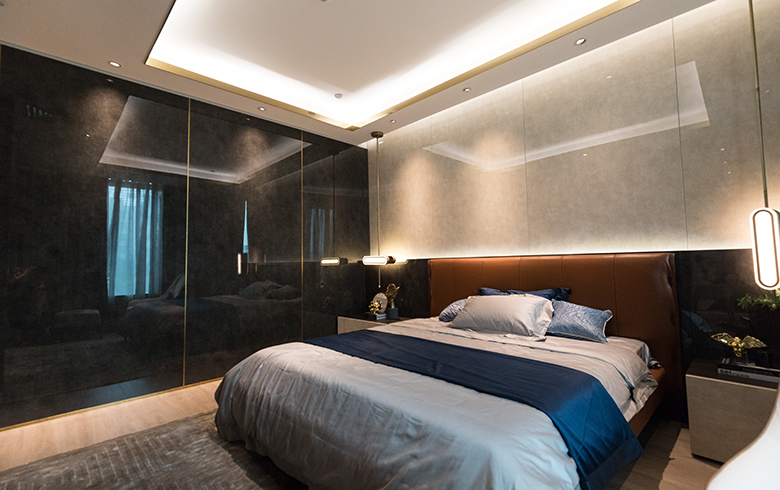 以清凈心看世界,以歡喜心過生活,以平常心生情味,以柔軟心除掛礙。客廳電視背景墻和沙發(fā)靠墻均采用凈色的護(hù)墻板,中間不用其他花色,一板到頂,干凈大氣,非對(duì)稱式均衡結(jié)構(gòu)、通透式層板燈設(shè)計(jì),營造優(yōu)雅舒適的生活環(huán)境。