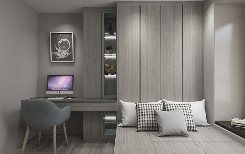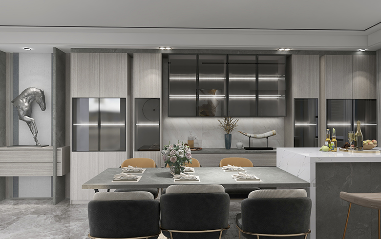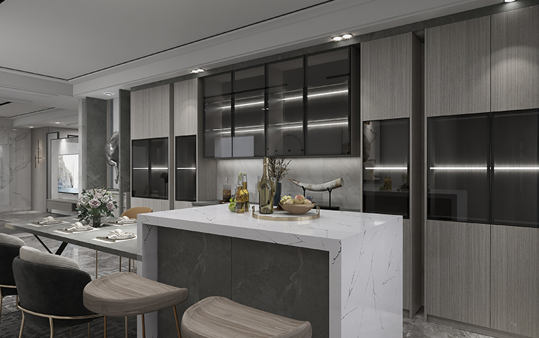 本案的簡約現(xiàn)代風(fēng)格,擯棄所有的繁瑣,加上一些幾何圖形元素,以簡為主,將舒適清雅的氛圍裝進(jìn)簡潔利落的空間。打造出一個通透明凈、清新雅致的現(xiàn)代空間。整個空間以暖色為基調(diào),讓人倍感舒適溫馨,搭配淺色沙發(fā),在定制家居中搭配黑框玻璃門及玻璃層板燈,在良好的采光下營造出透亮潔凈的視覺感受。而在空間處理上,采用開放式處理,減少空間壓抑感,同時加以深色大理石紋板材作為細(xì)致的點(diǎn)綴,賦予空間一抹藝術(shù)氣息。