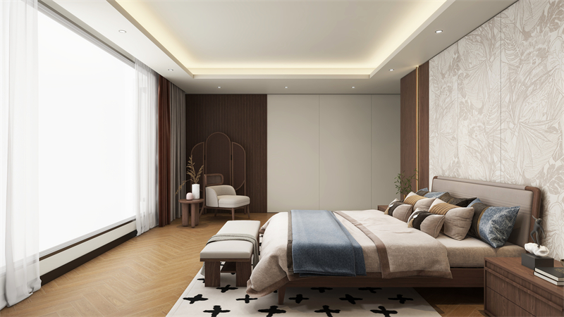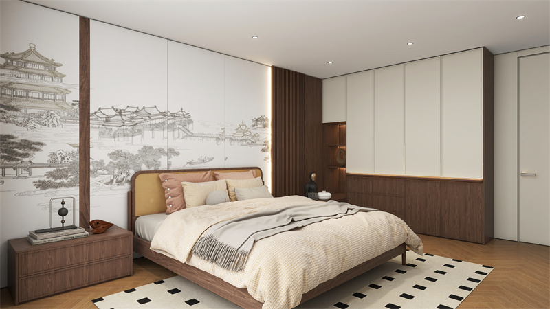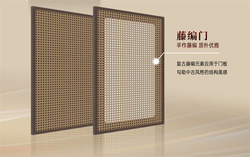 床頭背景墻清秋胡桃護(hù)墻板與藤編元素彼此呼應(yīng),立體質(zhì)感的格柵板加持,將中古風(fēng)的復(fù)古與雅致演繹得恰如其分。
