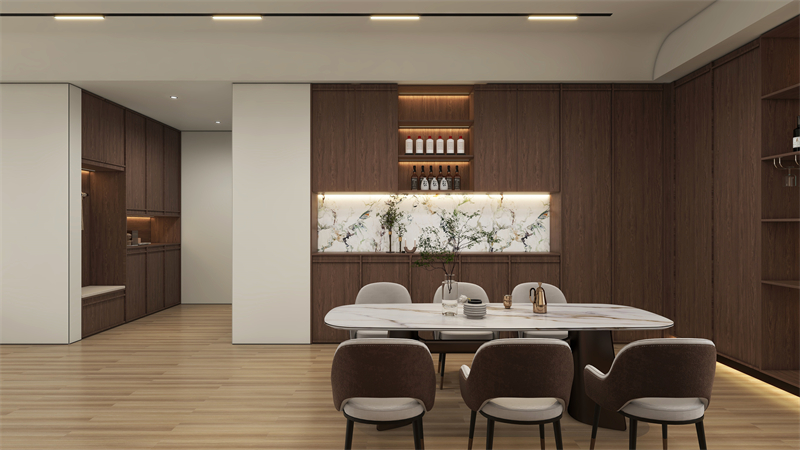 韶光系列汲取金秋的詩意靈感,煦色韶光,鎏金年華,于都市喧器中,借自然手法,將復(fù)古細(xì)膩的“清秋胡桃”棕色木皮紋理融于空間,營造高雅格調(diào)的詩意棲居空間。溫暖而深沉的棕色,細(xì)膩的紋理,自然的質(zhì)感,不禁讓人聯(lián)想到秋天的寧靜,打造溫暖懷舊且質(zhì)樸高雅的氛圍。