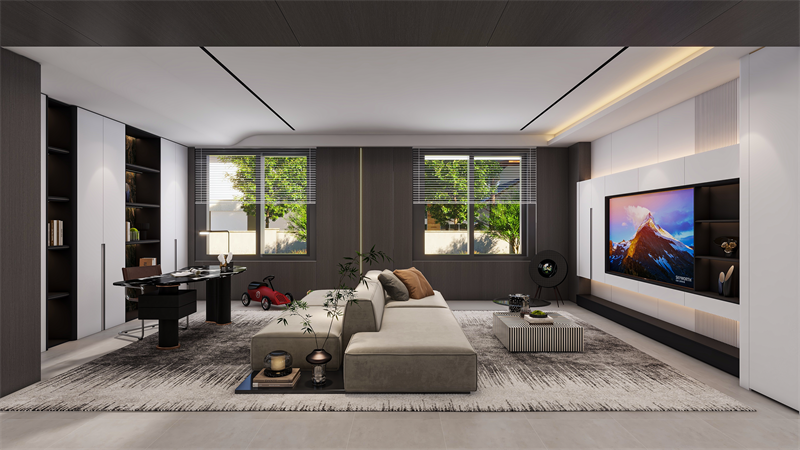 滿足年輕人向往的“去客廳化”設(shè)計,打破固有的裝修模式,以居住者的生活方式為起點,崇尚舒適至上。利用兩邊都可以坐的沙發(fā)做為隔斷,背后設(shè)計一個開放式書房。沙發(fā)背后放置書桌,讓人感覺安穩(wěn)踏實,讓空間的分區(qū)更明顯。