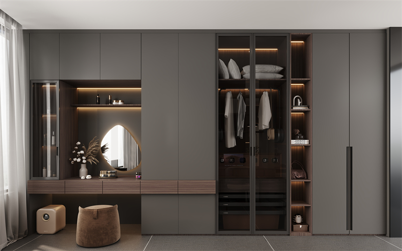 【收納區(qū)】臥室收納區(qū)設(shè)置成一個步入式衣帽間,靠墻定制一整排衣柜+梳妝臺,讓每一次的換裝都賞心悅目,為白領(lǐng)精英的美好形象加分,打造高顏值的精致生活。