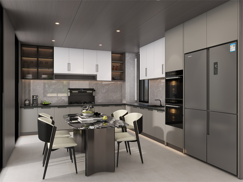 餐廚一體化設(shè)計,破除空間壁壘,打造通透自由家。L型廚房布局,科學(xué)分區(qū),下廚井然有序。柜電一體化設(shè)計視覺統(tǒng)一協(xié)調(diào),還能充分釋放儲物空間。針對廚房潮濕高溫的特殊環(huán)境,櫥柜采用22mm靜電噴粉門板定制柜,360°環(huán)繞防潮覆蓋,耐黃不變色,樹脂粉末高溫固化,色彩更耐看,打造簡約高級的廚房。