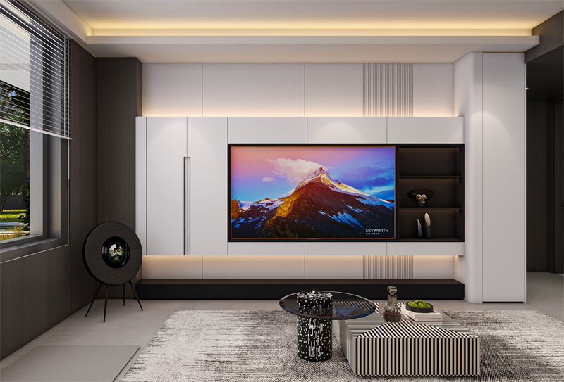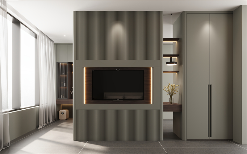 電視背景墻采用簡潔流暢的線條,與簡約的“晨露白”色彩完美融合,弧形轉(zhuǎn)角過渡,展現(xiàn)一種簡約而不失精致的柔美感。電視柜采用高端定制精湛工藝,包括黑科技的懸浮設(shè)計+柜中柜設(shè)計+拉米諾/無孔工藝,打破傳統(tǒng)墻面的厚重感,賦予空間輕盈靈動的觀感。