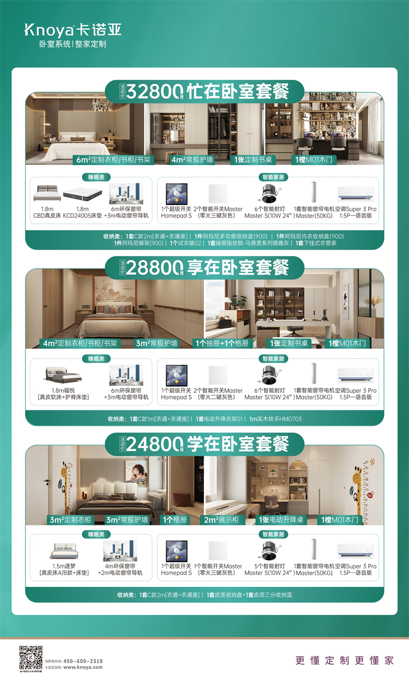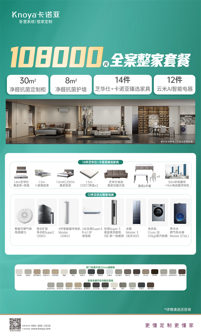 卡諾亞此次315活動,攜手多個高端品牌如芝華仕、CBD、云米科技等,為消費者提供一站式的家居解決方案?;顒悠陂g,卡諾亞除了以上2大套餐,還精心推出32800元忙在臥室套餐、28800元享在臥室套餐、24800元學在臥室套餐等,涵蓋臥室系統(tǒng)+整家定制兩大品類,包括定制柜、護墻板、全屋家具以及智能家電,聯(lián)手更多大牌,真正實現(xiàn)“整家定制更高配,全屋家具更滿配,智能家電更全配”的理念。