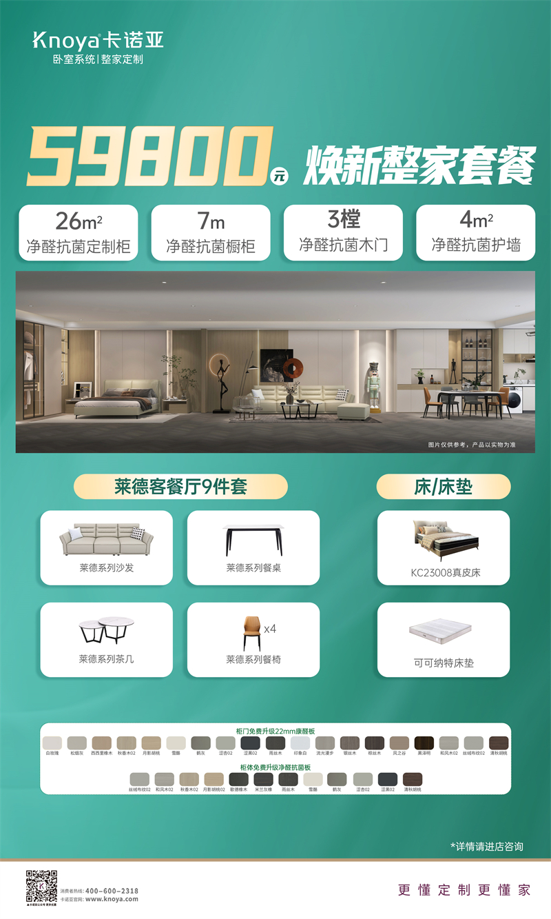 卡諾亞59800元全屋升級凈醛抗菌家套餐,采用凈醛抗菌板,擁有基材無醛添加、達ENF級國家最嚴環(huán)保標準、除醛、抗菌、防霉等優(yōu)勢,為毛坯房裝修、舊房改造以及精裝房的局部優(yōu)化提供了一站式的解決方案。