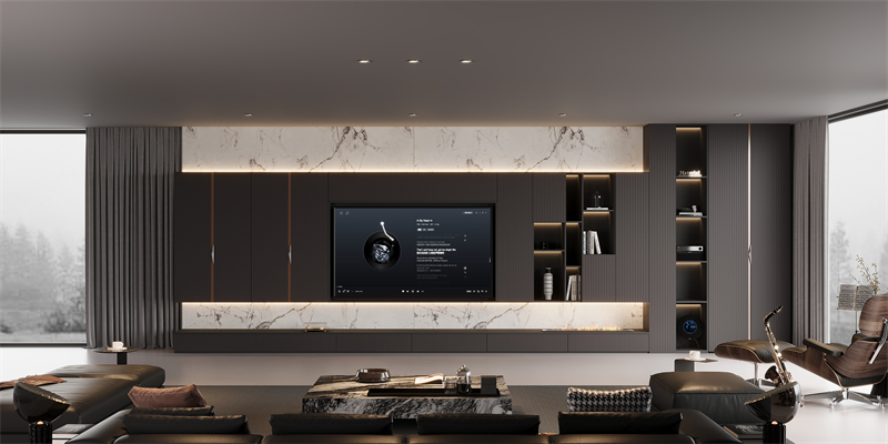 ·材質對話:直紋肌理板材與澀黑柜體形成深淺對比,數(shù)碼打印出來的紋理如大理石般通透,鋁木玻璃柜將金屬堅韌與木材溫潤完美結合。