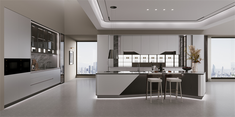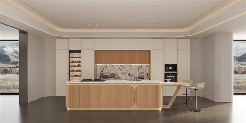 ·原創(chuàng)設計語言:源自鉆戒輪廓的門型,以戒指拉伸開的獨特輪廓融入門型設計,以左右圓弧+上下裝飾線勾勒立體層次,搭配鋅合金拉手,是功能與藝術、創(chuàng)新的融合;游艇造型中島臺與花瓣門板的組合,將豪華游艇的美學融入廚房空間。