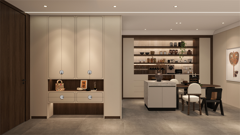 玄關(guān),作為家的第一道風(fēng)景,在方寸間盡顯山水意趣與禪意。拉手與門型的設(shè)計靈感源自禪意中式美學(xué)中的海棠花與水墨畫,仿佛一幅微縮的山水畫卷,盡顯文人意趣。綺羅布紋飾面質(zhì)感細(xì)膩,在光影的流轉(zhuǎn)中透露出織物的溫潤與雅致。展示格中,一器一物皆成景致。一入門,便能感受到“小隱于市”的寧靜與淡泊。