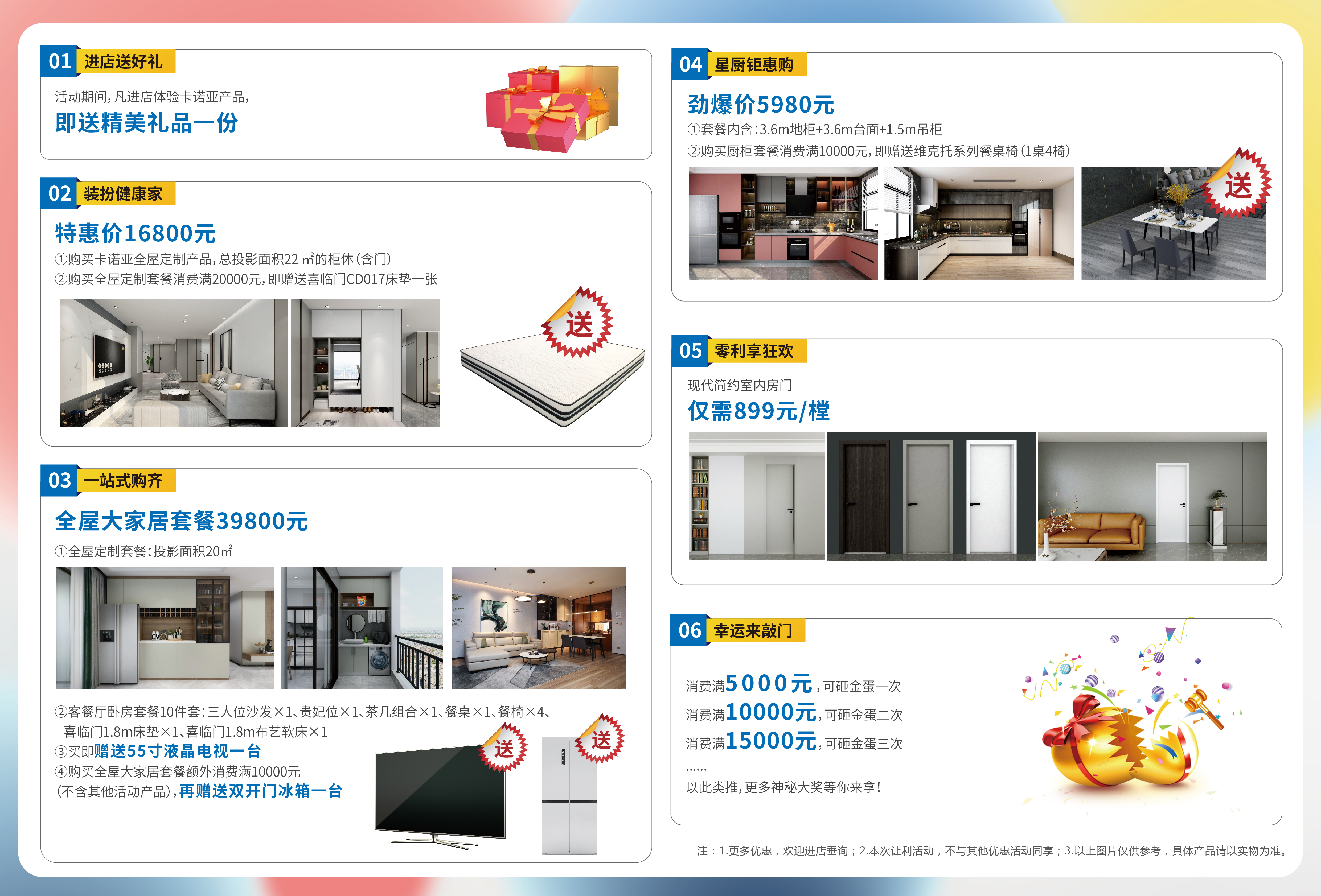 此次“健康定制,為生活加點美好”618聚惠盛典送福利活動,截止6月18日,親臨卡諾亞定制家居當?shù)貙Yu店,除了尊享以上四大套餐外,還能搶到眾多驚喜:進店即送精美禮品一份;消費滿¥5000,砸金蛋1次,滿¥10000,砸金蛋2次,滿¥15000,砸金蛋3次……618大促提前引爆,活動詳情請咨詢當?shù)貙Yu店,卡諾亞定制家居歡迎你來體驗。