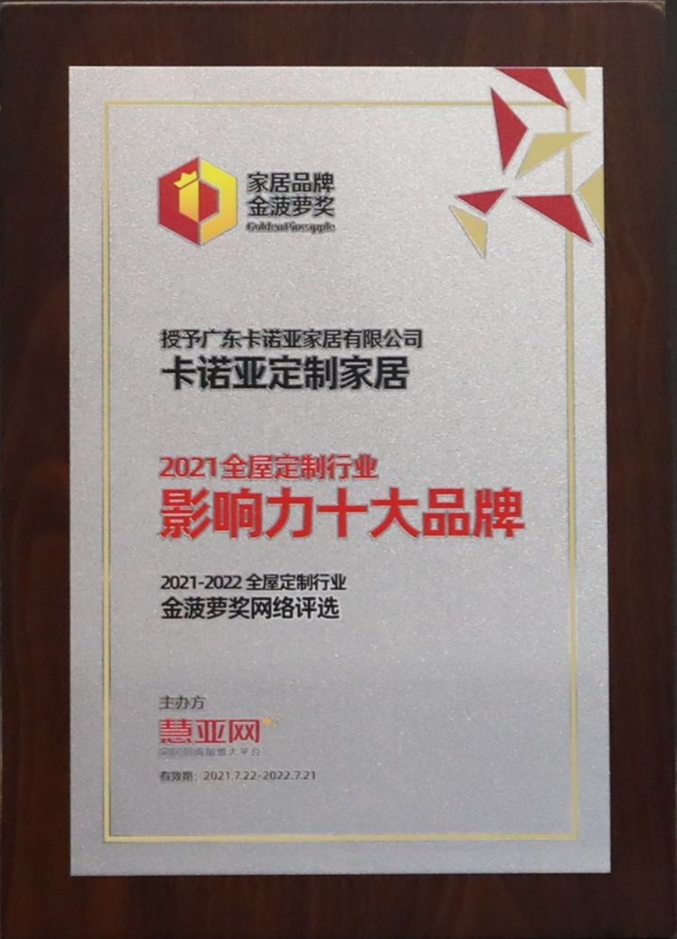 2021年7月22日,中國建博會×慧亞網(wǎng)聯(lián)合主辦的第六屆中國大定制家居營銷發(fā)展論壇暨中國家居品牌金菠蘿獎頒獎盛典,在廣州舉行。歷經(jīng)半年來自經(jīng)銷商與用戶網(wǎng)絡票選結果的公布,卡諾亞定制家居憑借強大的品牌影響力、優(yōu)質的產(chǎn)品與星級的服務,最終脫穎而出,榮膺“2021全屋定制行業(yè)影響力十大品牌”美譽。