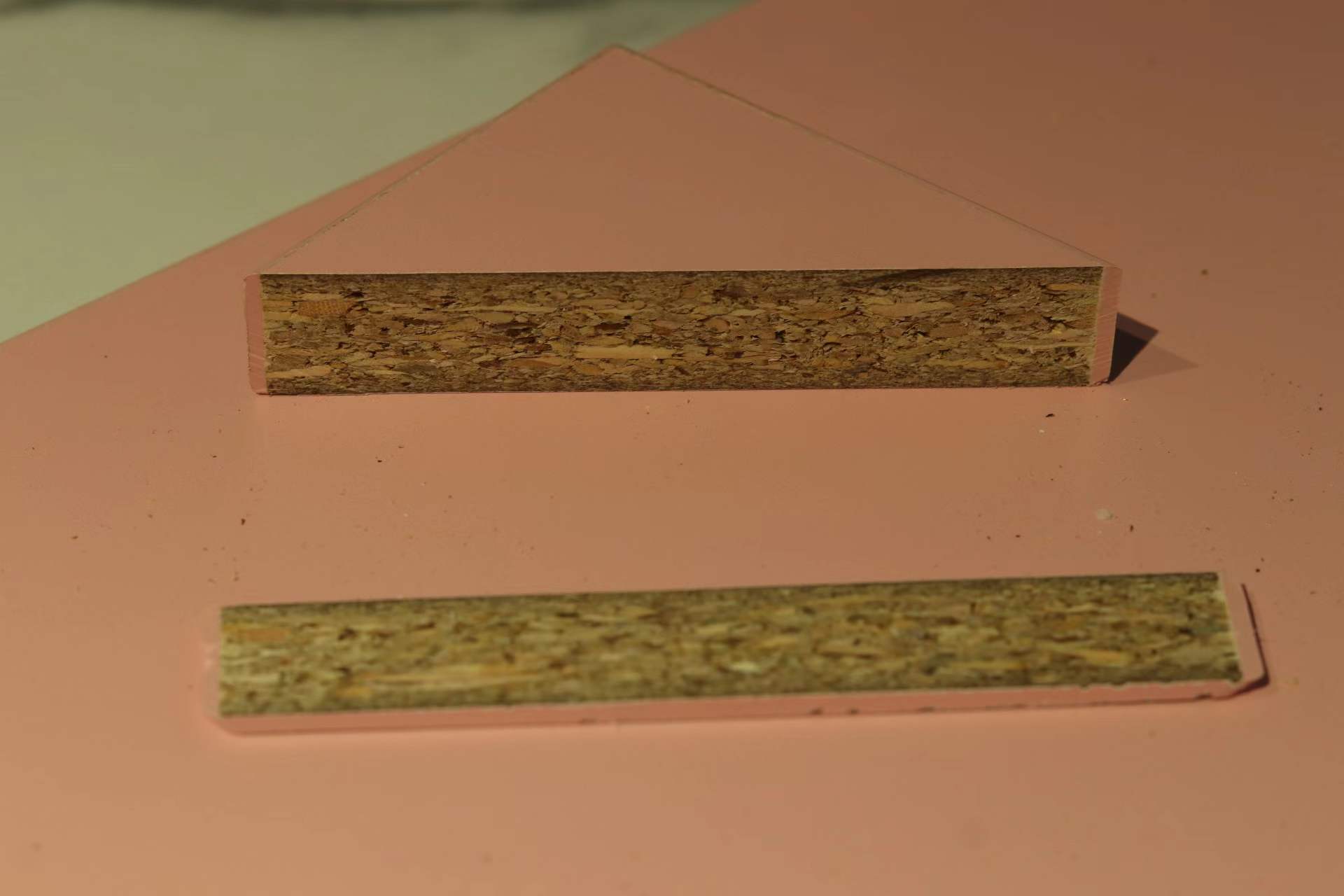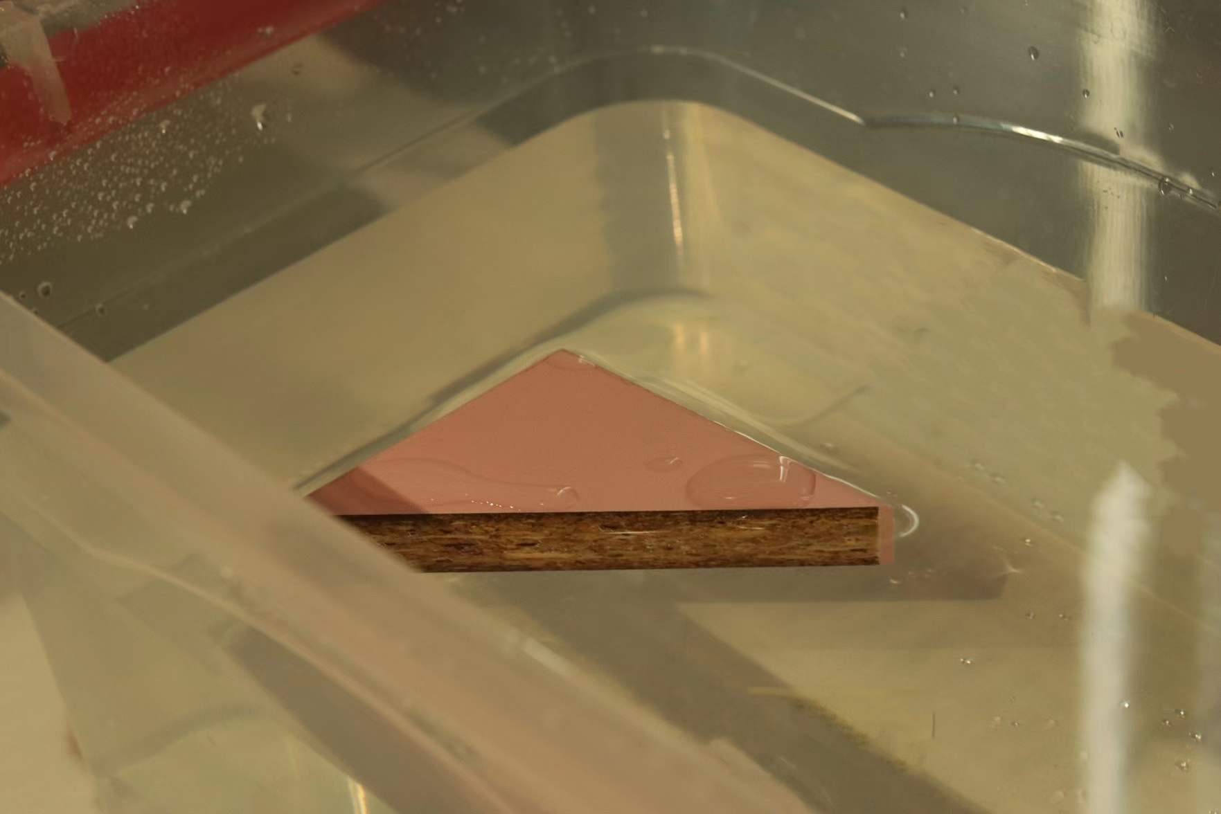 為檢驗板材防潮能力,小編將切割后的板材放入水中浸泡,幾個小時之后,將板材撈起發(fā)現(xiàn),看不出板材變形、膨脹,質(zhì)地依舊干燥且輕盈。這是因為康醛板使用原木木種顆粒,防潮性能強,加上聚氨酯粘合劑(MDI膠)是制造密封劑和防水涂料的原料,所以防水防潮能力相當出色,更加適用于廚房等潮濕的空間。