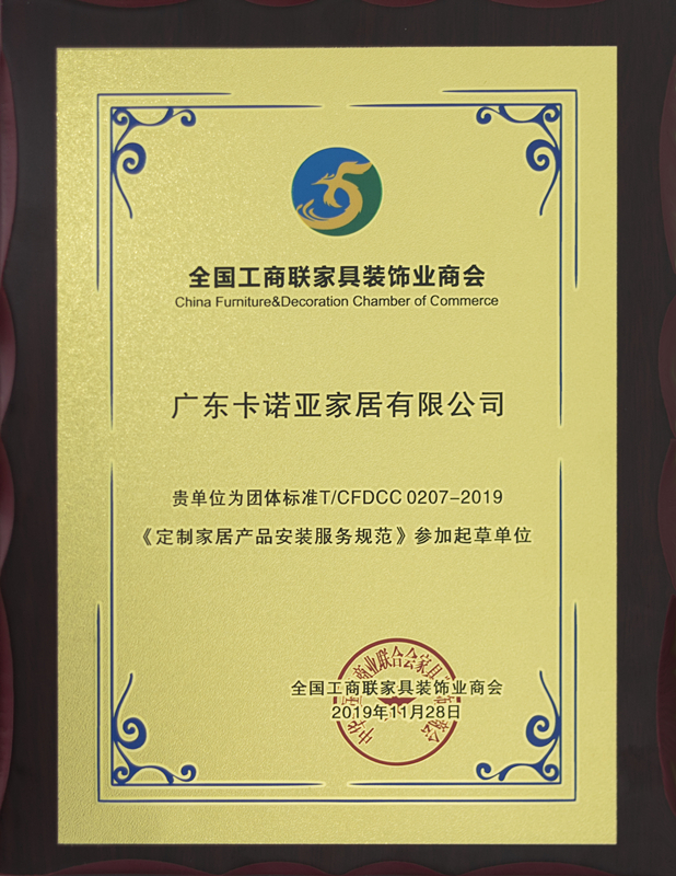 近日,中國全屋定制十大品牌之一的卡諾亞,獲得由全國工商聯(lián)家具裝飾業(yè)商會頒發(fā)的“中國家居業(yè)高質量發(fā)展示范企業(yè)”,同時卡諾亞還成為團體標準T/CFDCC0207-2019《定制家居產(chǎn)品安裝服務規(guī)范》參加起草單位,這是對卡諾亞專注定制家居18年品牌實力的肯定與鼓勵。